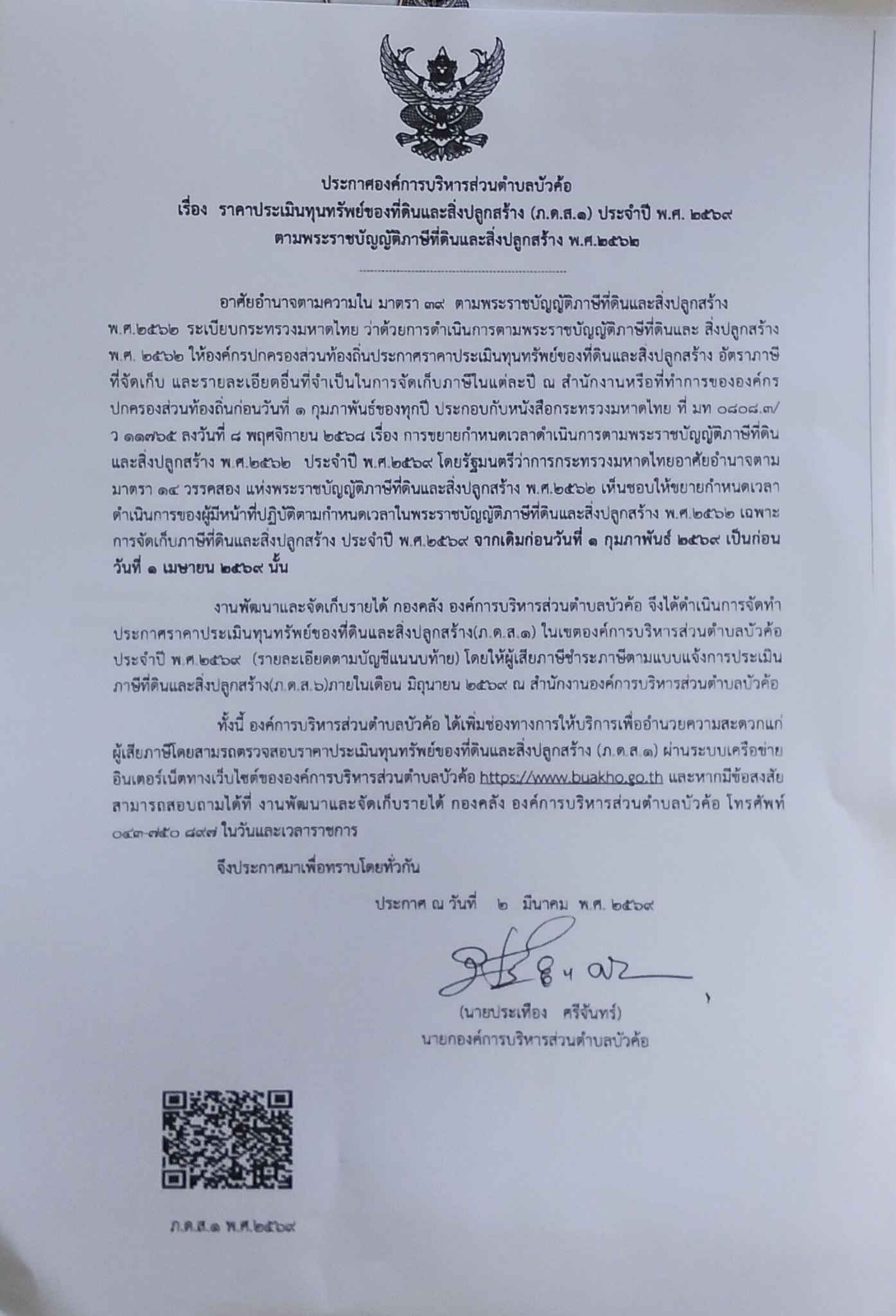 ประกาศองค์การบริหารส่วนตำบลบัวค้อ เรื่อง ราคาประเมินทุนทรัพย์ของที่ดินและสิ่งปลูกสร้าง (ภ.ด.ส.1) ประจำปี พ.ศ.2569 ตามพระราชบัญญัติภาษีที่ดินและสิ่งปลูกสร้าง พ.ศ.2562