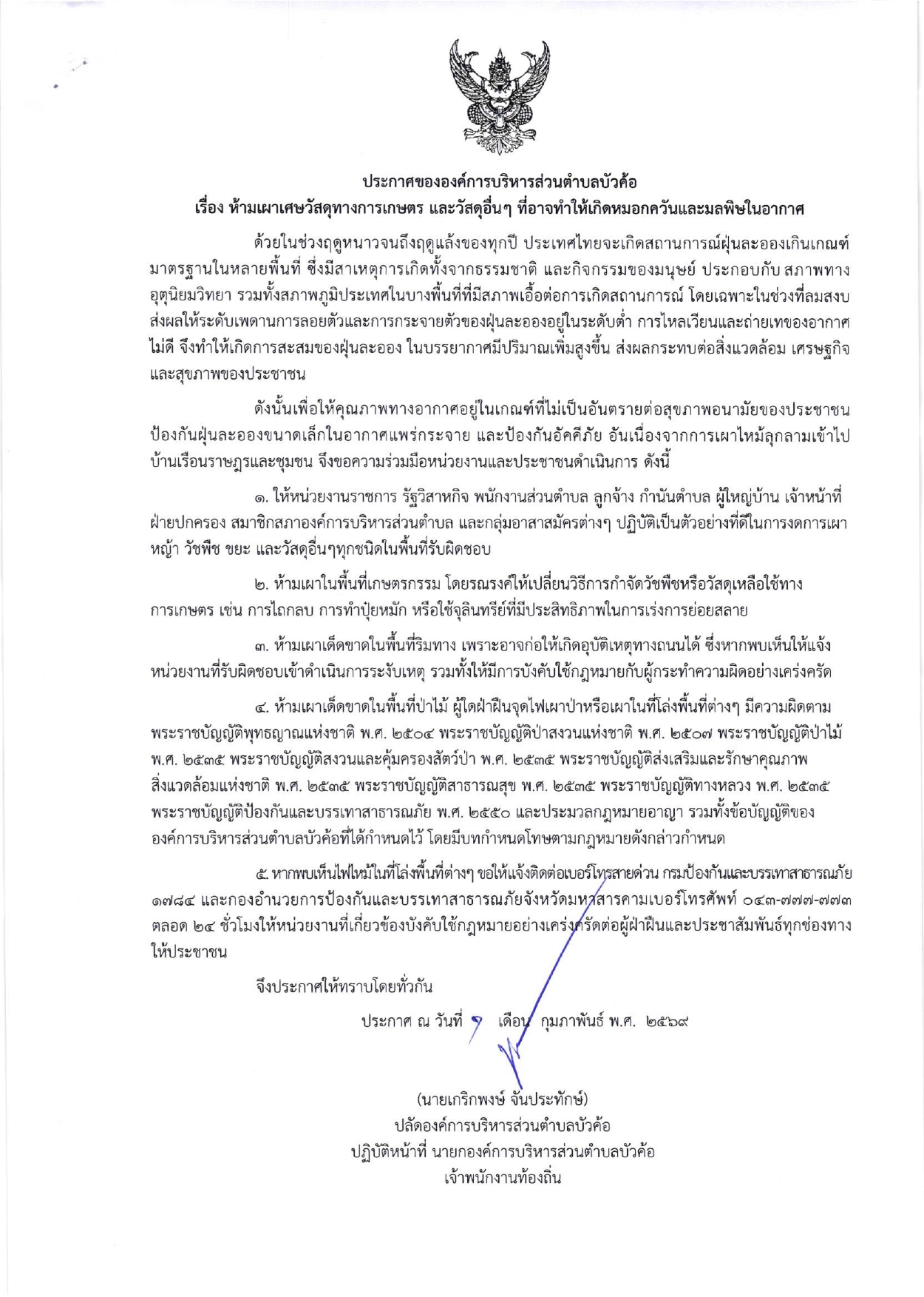 ประกาศองค์การบริหารส่วนตำบลบัวค้อ เรื่อง กำหนดพื้นที่ควบคุมเหตุรำคาญ พ.ศ.๒๕๖๙และห้ามเผาเศษวัสดุทางการเกษตร
